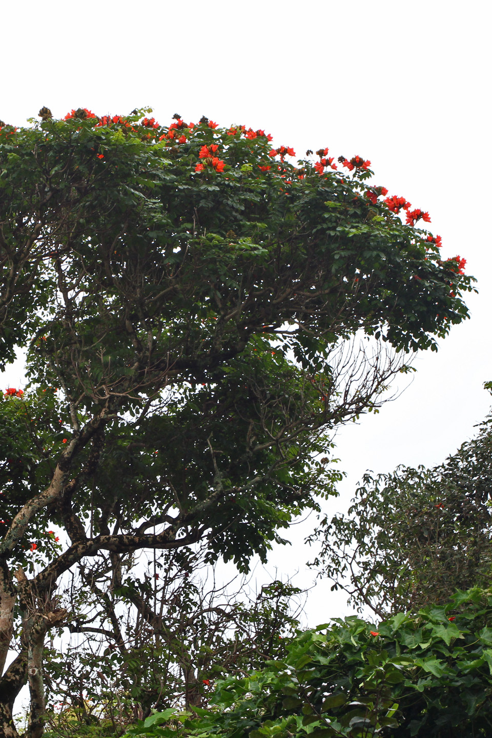 Of course, rainbows frequently come with…rain…this is the little road we were on. Â The Road to Hana comes complete with warnings against motion sickness and fear of heights! Â And one lane bridges, and corners you honk your horn on just to be sure it is clear…