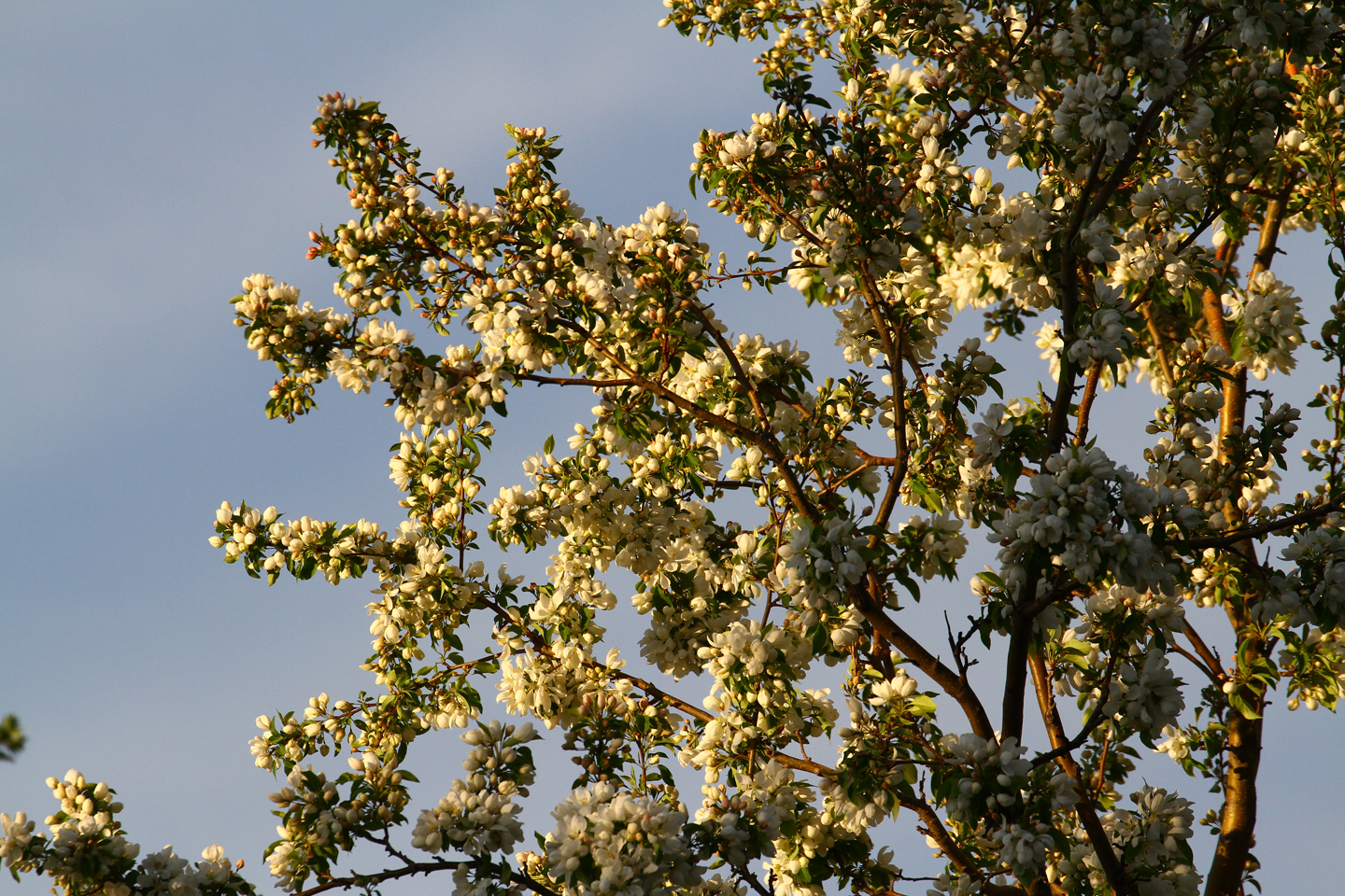 I was sitting out in the Sun Chair on the back deck, enjoying the gentle (?) breeze and slightly brisk evening air whilst waiting on aviary arrivals. Â The Barrow Backyard Wildlife Refuge remained, sadly, vacant. Â But I did notice the blossoms on the trees swaying in the wind and warm light from the setting Sun and took a few photos anyway. Â These are un-processed, just resized.