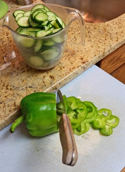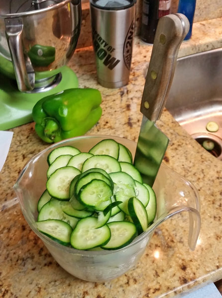 Wash and thinnly slice 7 cups cucumbers. Leave skin on