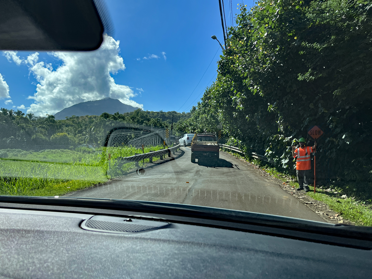 Between Hanalei and Princeville there are two one lane bridges, with a severe jog between them. “Local Custom” allows four or five vehicles from one side to go, then the rest wait while the other side goes. It works pretty well, allthough reight now it is being controlled by road workers… There are several more shorter one lane bridges once you go past Hanalei.