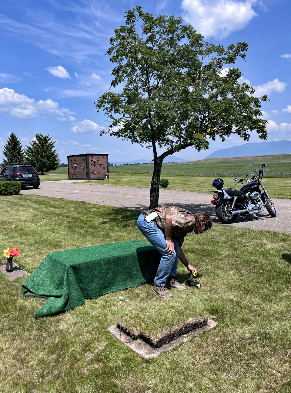 We almost missed putting popcorn in the “vault” with the ashes…there is the maintenance guy who does the actual putting in the ground, Timber, a riding buddy of Dad and Sarah’s from the Christian Motorcycle Association and brother Dennis. A little popcorn is visible on the green “stage”.