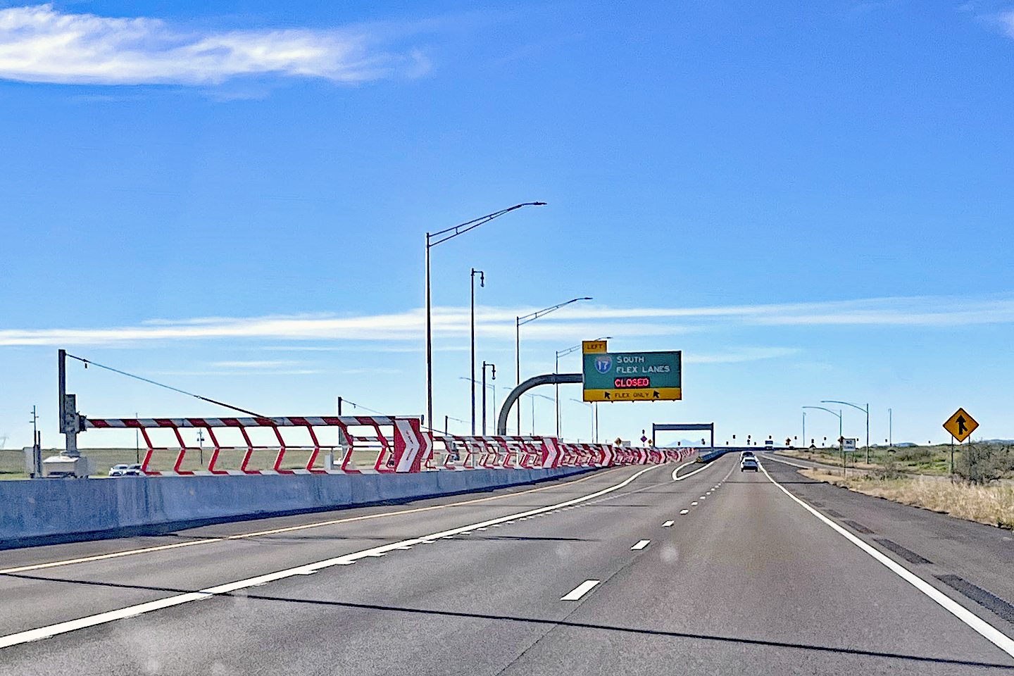 We had to drive to Phoenix this morning for a dermatology appointment. There is a rest area, previously seen here, about half way, just before the start of a BIG hill running down past Bumblebee, Arizona! There was considerable construction when we were here two years ago, and it is finished now! They made reversible “flex lanes” like they use in big cities. Phoenix counts as a BIG city, but this is, frankly, in the middle of NO-WHERE, AZ! The Dailylife Wife looked it up on our way home, and it is essentially an HOV lane for northbound traffic Monday through Saturday. Sunday is just for Southbound traffic!