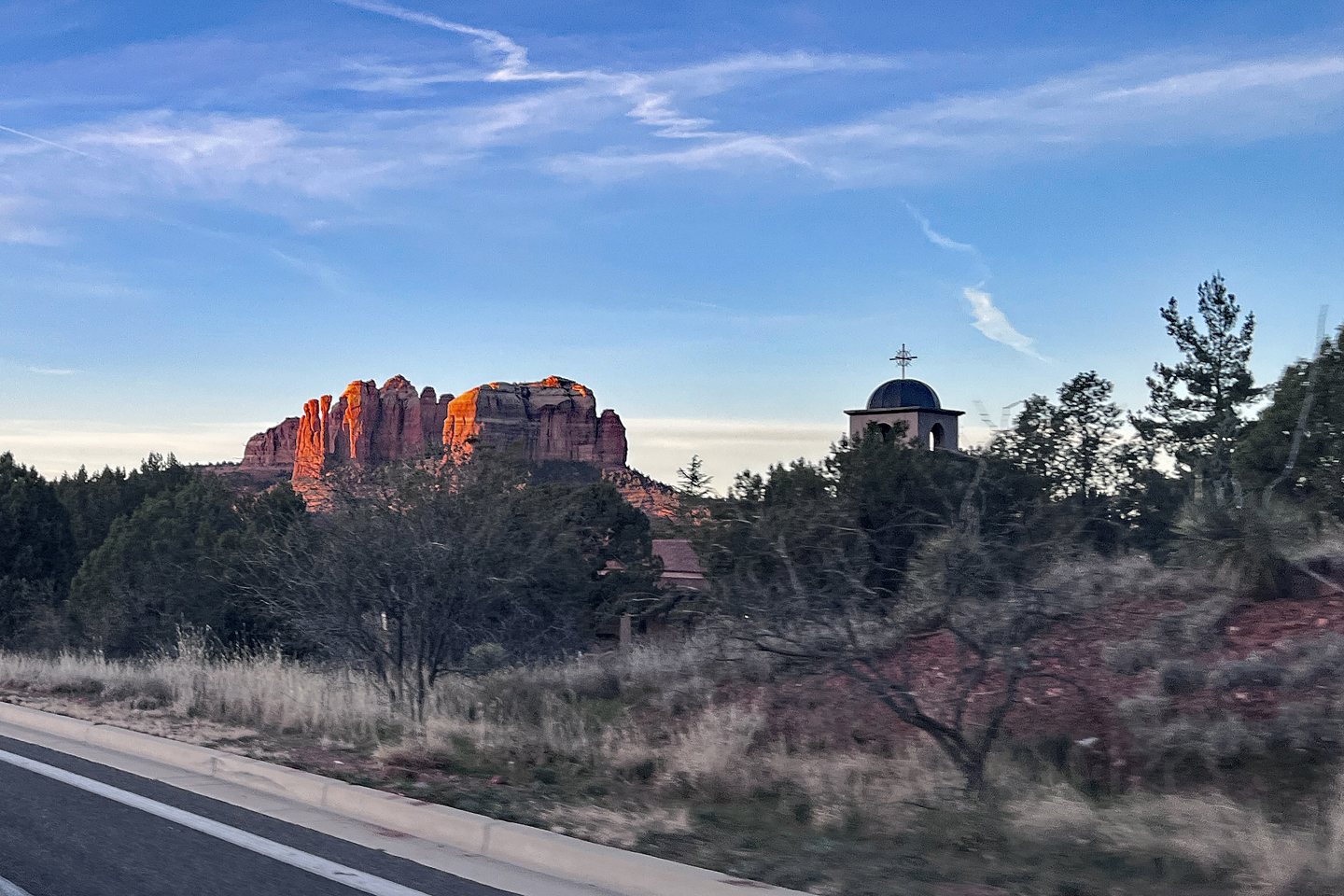 On the way North up on AZ89A is the Immaculate Conception Catholic Parish, with the red rocks near Sedona beyond it.