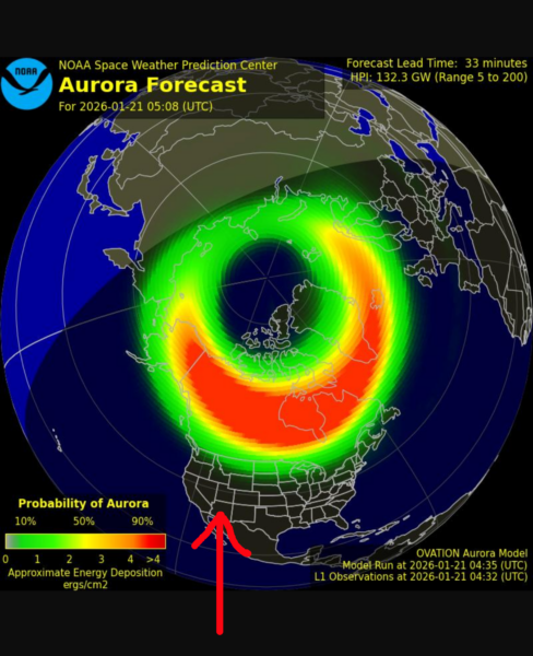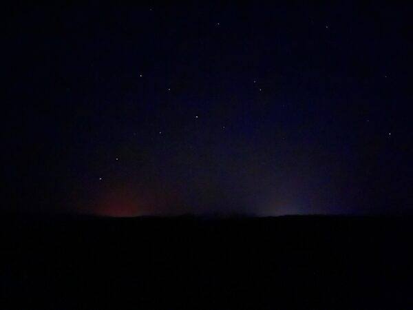Then came a nice afternoon of doing nothing, because we were both stuffed. As it started to get dark, the Northern Lights came on again! They were out due to the strongest solar storm in 25 years. I couldn’t see them here when I looked last night, but there were photos from Sedona (15 miles north) and Prescott (20 miles south over the mountain). So tonight it looked as good as last night on the Forecast site, so out I went. The red arrow is about where Clarkdale is.