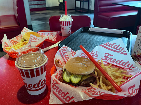 We ran up the hill to Flagstaff yesterday for lunch. We went to Smashburger*…errr…Freddy’s Frozen Custard and Steakburger…they HAVE Smash Burgers…or at least Smash Burger Tacos… It was a pretty good lunch, even though I am not a big fan of those skinny shoestring fries. The shake, as seen here yesterday, was excellent! There is a Freddy’s in Missoula on North Reserve near the Interstate. It would be nice to have one in Grff’lls, too. That would make 561 locations!