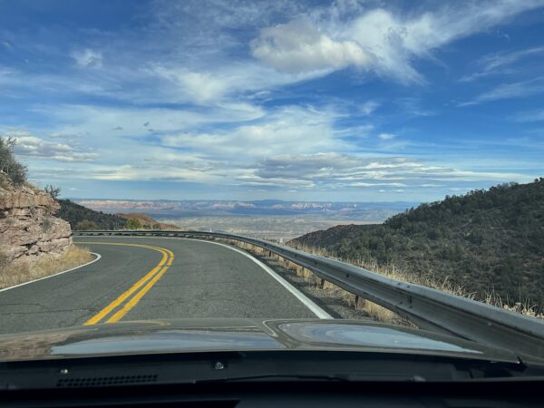 A Dailylife Wife photo of the Verde Valley on the way back over the hill from Prescott, above Jerome. Sedona is at the base of those rocks in the middle. Only 30 miles by road, less by air.