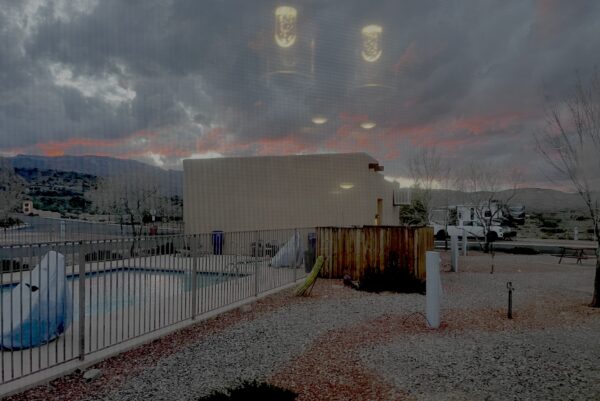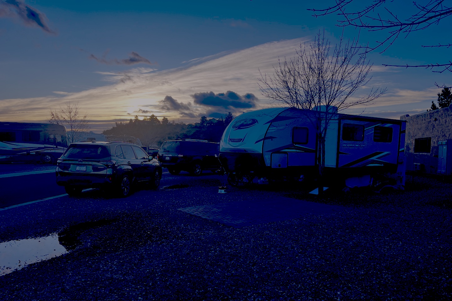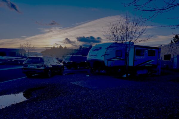 Early morning looking by our trailer and over our car. It was a much drier and less windy day than yesterday was. We can’t recall ever bouncing around in our trailer due to wind gust as much as we did last night! While it blew off the slide out roof yesterday evening, at some point our Starlink antenna, which was down on the ground, got flipped by the wind. The thing is not light…