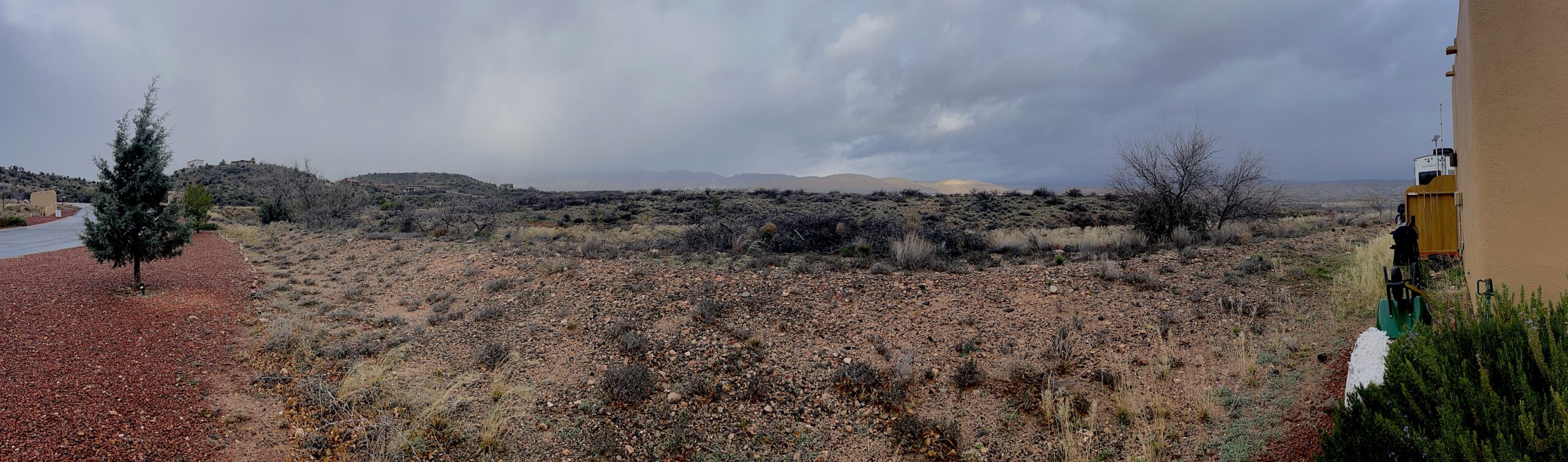 A whole panorama, looking NorthWest. The Rain Spirit entrance is on the left, the back of office is on the right.